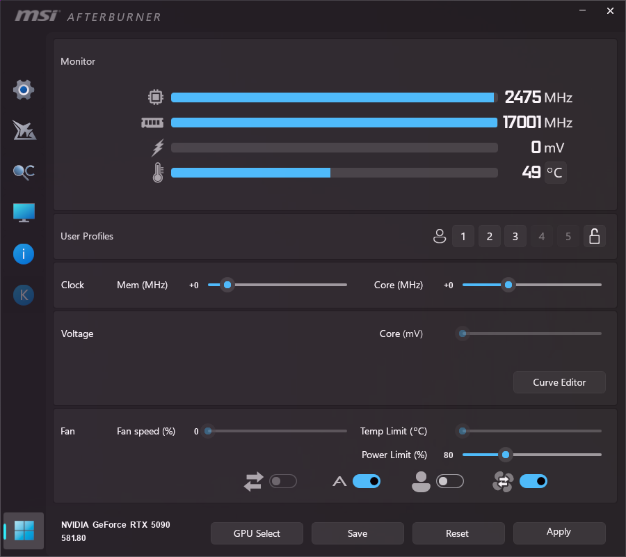 Wer keine Lust auf Kurven hat, schiebt einfach den Power Limit-Regler auf 80%. Die Karte verliert kaum spürbar FPS, spart aber sofort massiv Strom. Die Kurven-Methode ist jedoch noch effizienter!