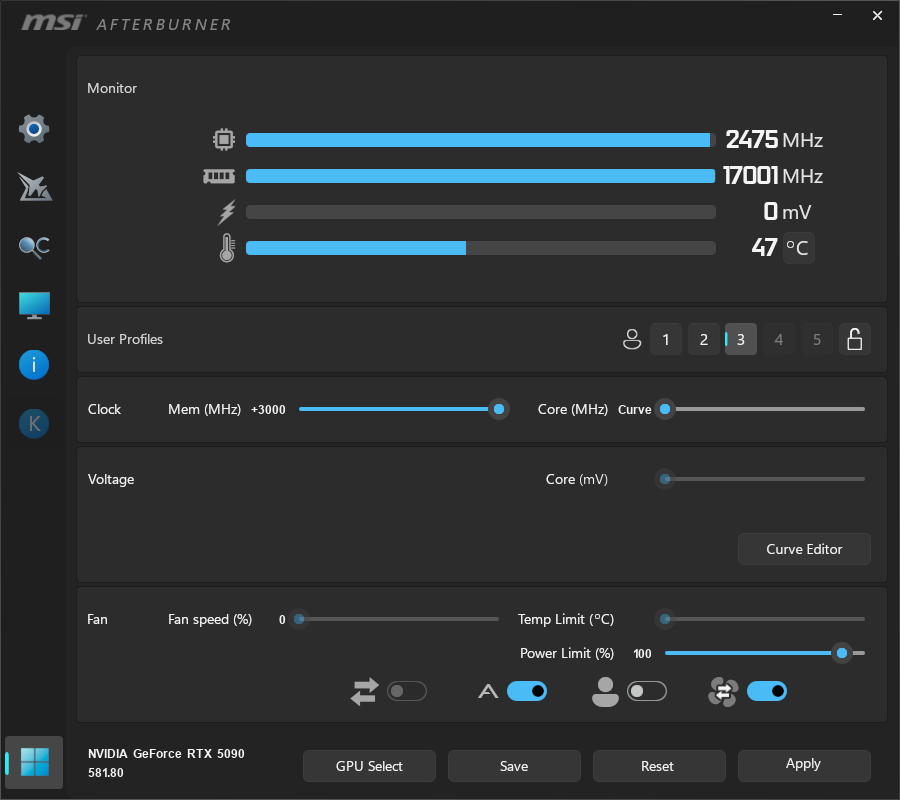 Wenn euer Undervolting stabil läuft und die Temperaturen passen, könnt ihr bei der 5090 meist noch eine ordentliche Schippe drauflegen. Der neue GDDR7-Speicher ist extrem potent und langweilt sich im Werkszustand fast schon. In der Regel könnt ihr den Memory Clock im Afterburner ohne große Probleme um +3000 MHz erhöhen.