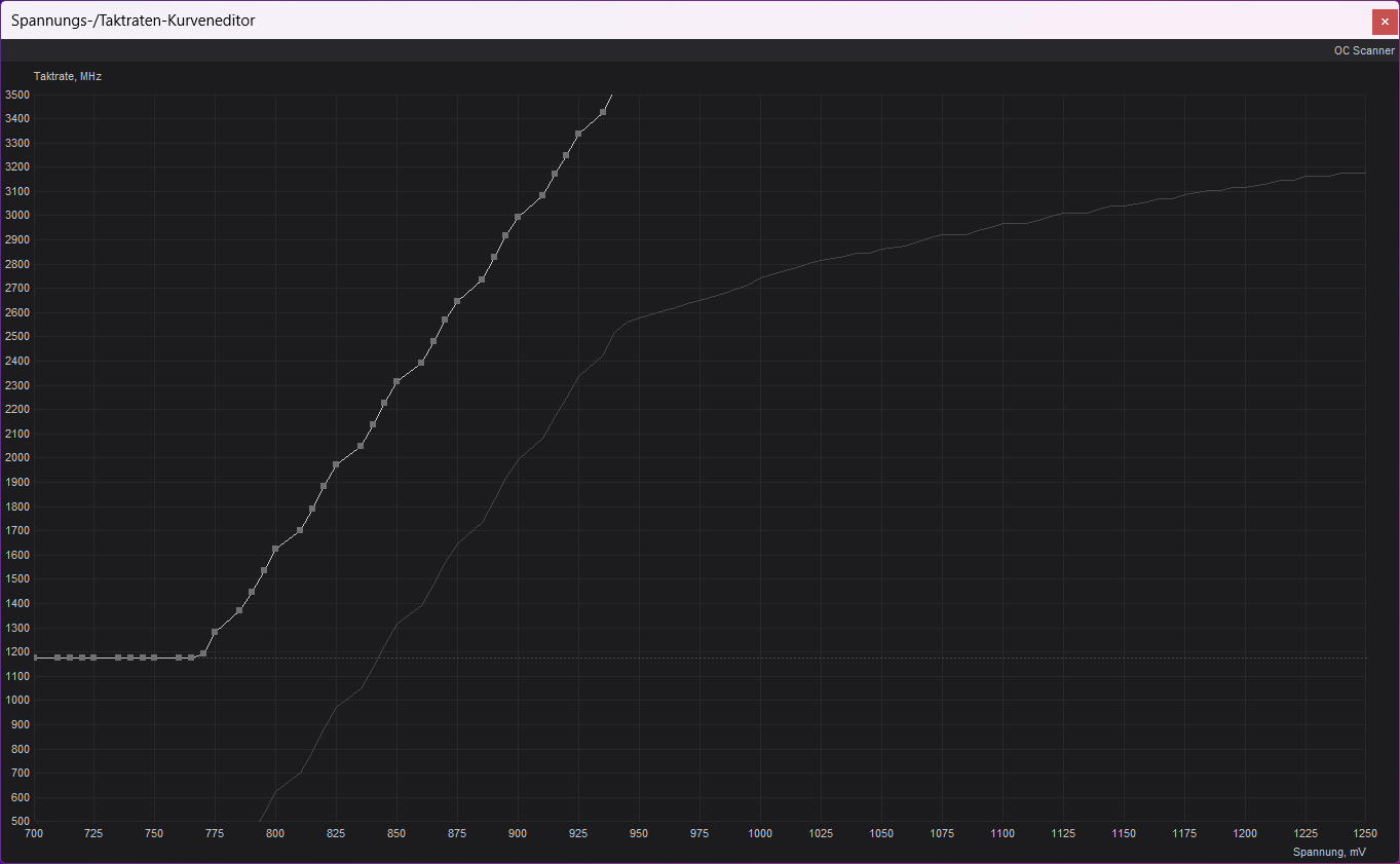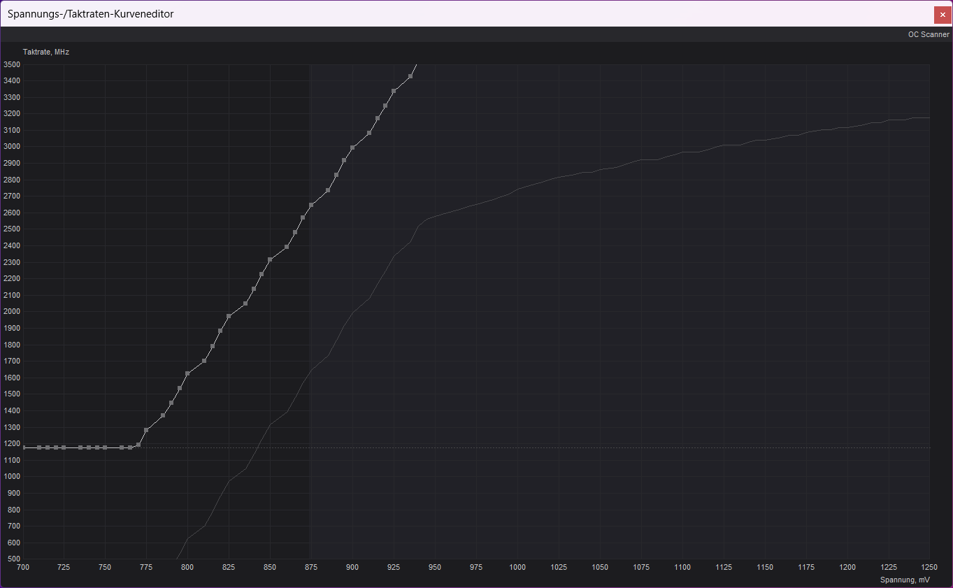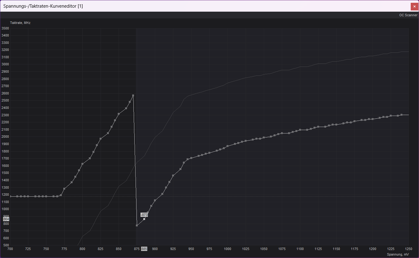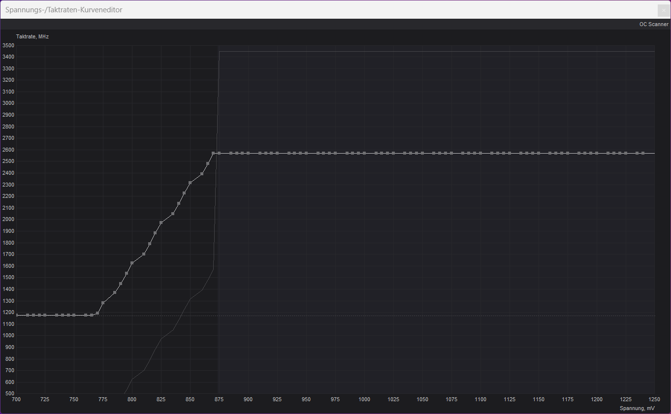 - Schiebt die markierten Punkte unter euren Zielwert. Mit einem Klick auf Apply wird die Kurve ab 0,875V begradigt. Die Karte wird nun maximal diese Spannung nutzen.
